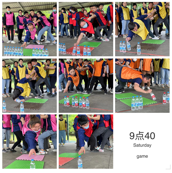 這個游戲的規則是每個隊一個圓圈,每個隊員都要穿過這個圓圈,看那個隊用時最短,每個隊都奮力爭先。眾人齊心協力,心向一處靠,力往一處使。團隊協作精神體現的淋漓盡致。