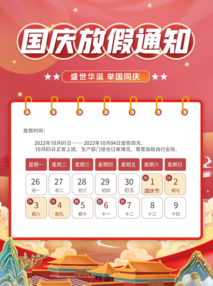 溫馨提示:因放假時間長,防疫工作任到重遠,人流量多及風險地區不要涉足,路上注意安全,并遵守有關法律法規,提前做好返程安排,確保如期上班。預祝大家國慶節快樂!